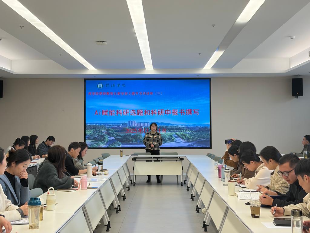为进一步推动数智技术与教师科研工作深度融合,破解青年教师在科研选题与申报书撰写中的现实难题,11月11日下午,商学院在教三楼530会议室举办教师数智化教学能力提升系列讲座第三场。本次讲座以“AI赋能科研选题和科研申报书撰写”为主题,特别引入中国高等教育培训中心“金师金课金教材第12期:教师AI科研素养提升在线研修班”优质课程资源,由商学院教学副院长吴新静主持,全体青年教师参会,现场学习氛围浓厚,互动交流踊跃。
