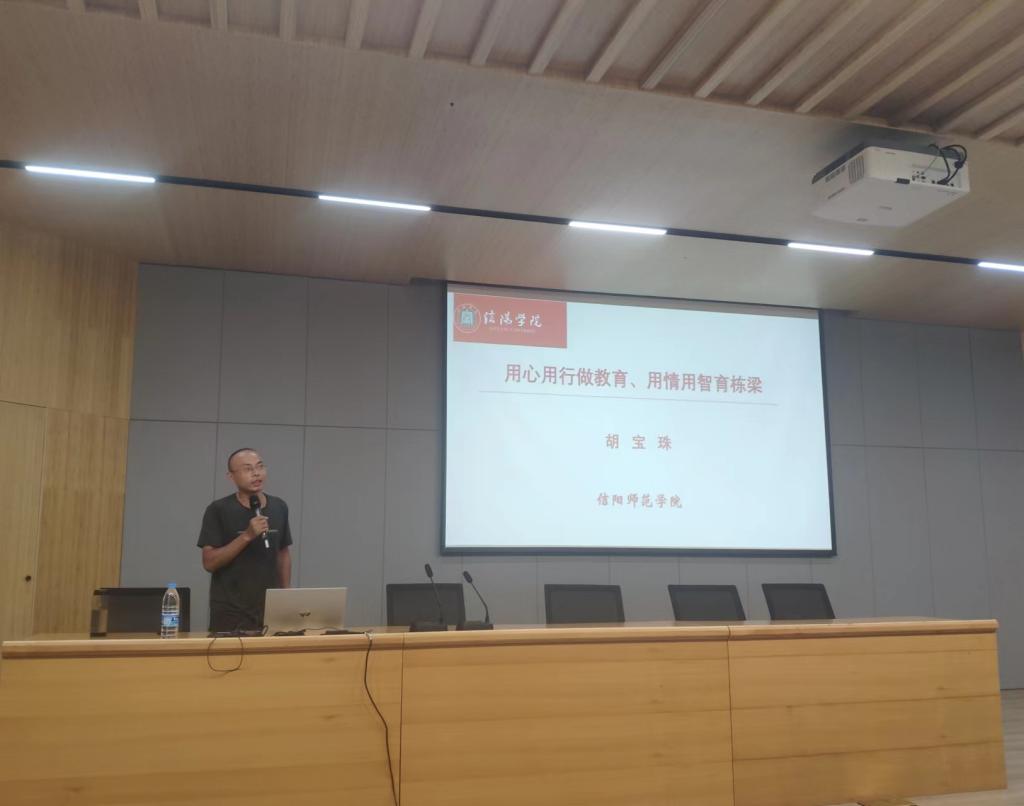 为加强课程教育教学建设,进一步提升教师教育教学水平,8月19日下午,商学院特邀信阳师范学院旅游学院副院长胡宝珠博士为全体教师作了一场题为“用心用行做教育、用情用智育栋梁”的报告会。报告会在图书馆101学术报告厅举行。商学院院长于世良、副院长李毓、吴新静和全体教师到场聆听了讲座。吴新静主持了讲座。