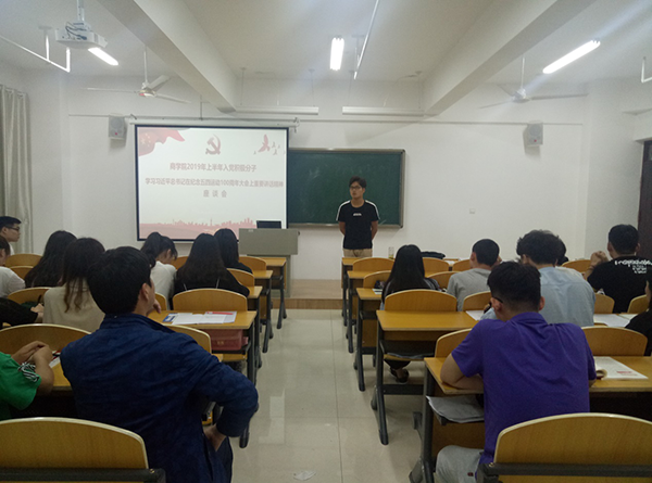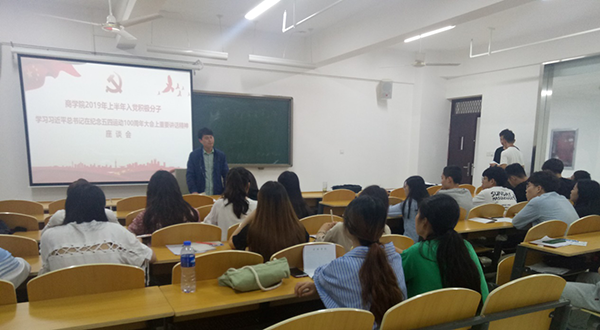 5月16日,商学院2019年上半年入党积极分子在综合楼603开展“学习习近平总书记在纪念五四运动100周年大会上重要讲话精神”主题研讨学习活动。党总支书记张富庄参见了研讨活动。