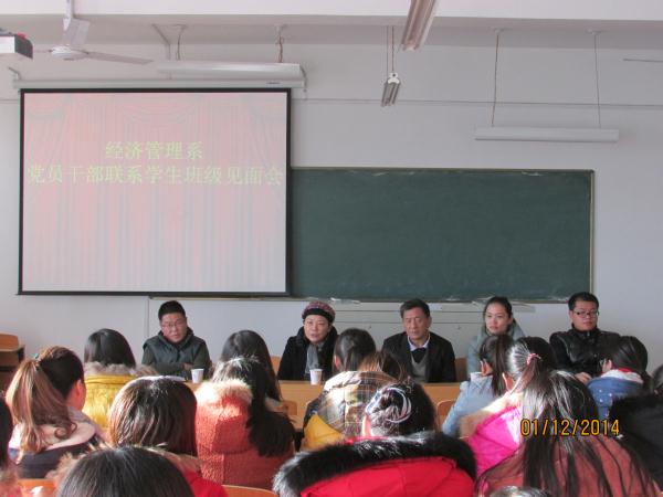 为贯彻落实学院党员干部下基层联系班级工作措施,12月1日下午,院党委书记张莉教授深入经济管理系开展党员干部联系班级活动。系主任王金献教授、党总支副书记李肖利、管理学教研室主任赵俊远、辅导员盛士蔚及2012级旅游管理本科班学生参与本次活动。活动由李肖利主持。