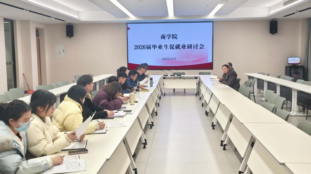 为应对就业市场新形势,精准推进2026届毕业生就业工作,提升就业服务实效,12月29日,商学院在教三楼530会议室召开2026届毕业生促就业研讨会。商学院党总支书记胡秀云、学工负责人花端阳,四个就业服务工作小组组长、副组长及全体2026届毕业班辅导员参会,会议由花端阳主持。