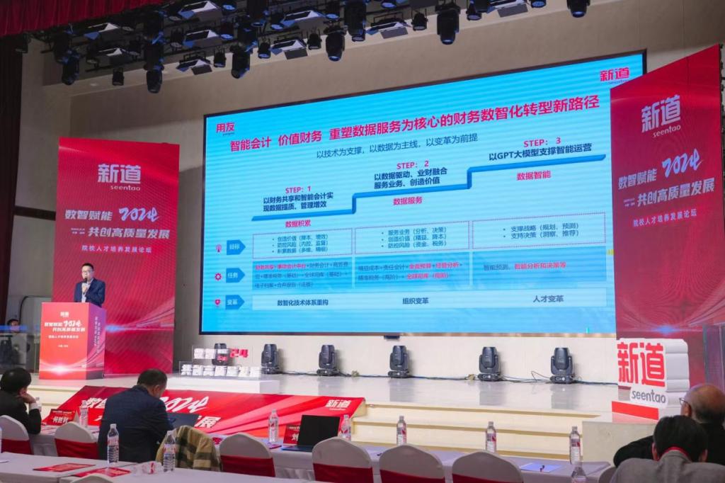 上午,论坛正式开幕,各大院校嘉宾、新道科技资深专家分别就数智赋能、产教融合协同育人及未来专业建设的工作设想进行分享。下午,会议由主论坛分为新商科和新工科两个分会场,新商科分论坛由院校嘉宾及新道科技专家分别分享了“践行产教深度融合,推动区域经济发展”“数智驱动,融合创新,打造高质量财经人才培养新引擎”“新商科数智化教改与人才培养模式探索”等的演讲。