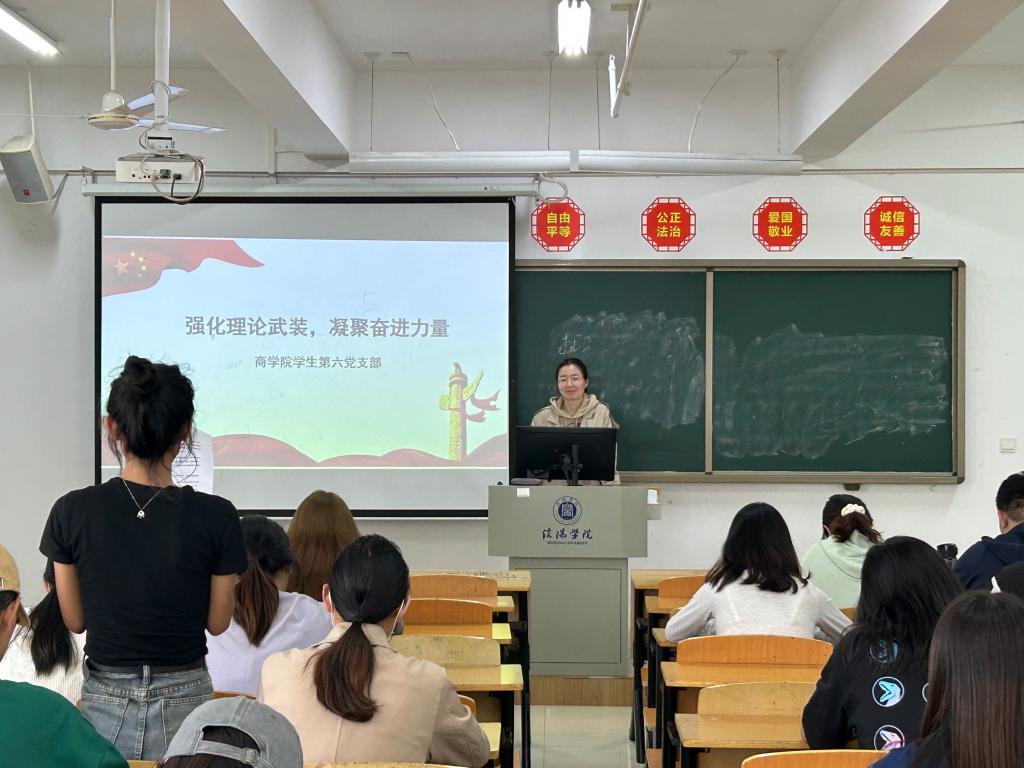 学生第六支部书记张莹开展了主题为“强化理论武装,凝聚奋进力量”的党课,她指出加强理论学习,是提高党员干部政治素质的需要;是与时俱进,创新发展的现实课题;是完善自我,提高素质的客观要求。党员干部要不断学习,才能做到与时俱进,跟上时代发展的步伐。