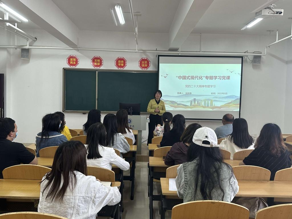 教工第一党支部书记吴新静以“中国式现代化”为主题,围绕中国式现代化的丰富内涵、本质要求、理论背景和依据、总的战略安排等方面进行了学习交流和讨论。最后强调新征程上,在以习近平同志为核心的党中央坚强领导下,在习近平新时代中国特色社会主义思想科学指引下,我们教工党员也要撸起袖子加油干,在今后工作生活中,加强学习常态化,将学习成效转化为做好各项工作的强大动力,立足岗位作贡献,履职尽责当先锋,为推进中国式现代化贡献智慧和力量。