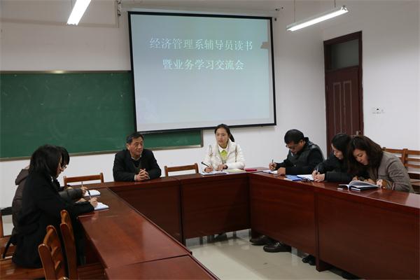 经济管理系辅导员读书暨业务交流学习活动将从本周开始每周一次定期举行,每次50分钟读书自学,40分钟业务交流,旨在加强辅导员队伍建设,提升辅导员工作的能力和水平,打造一支政治强、业务精、纪律严、作风正的思想政治教育工作队伍。