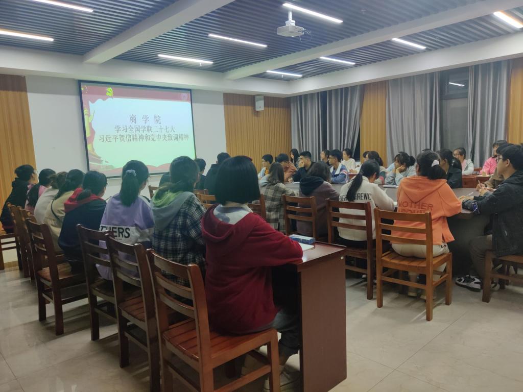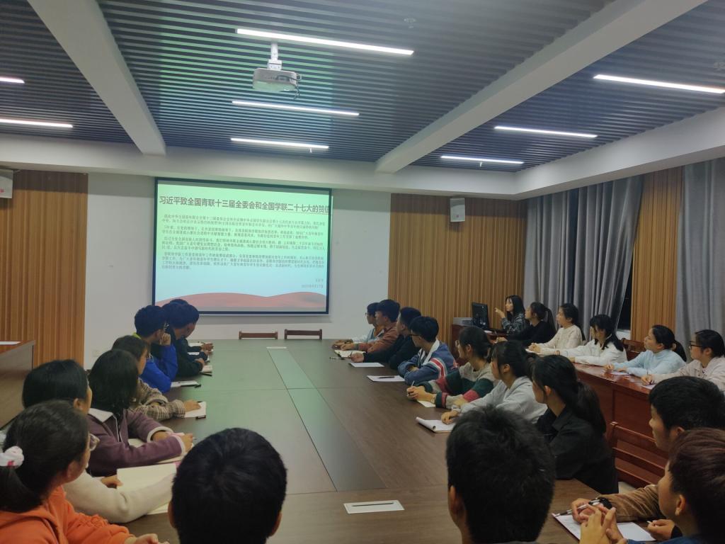 为深入学习贯彻习近平总书记致全国学联二十七大的贺信和党中央致辞精神,全面贯彻落实全国学联二十七大会议精神,持续推动学校共青团、学生会改革进一步深化,激发我院青年师生以拼搏的精神、奋进的姿态谱写青春之歌。10月4日,商学院团总支在综合楼715会议室召开学习习近平总书记致全国学联二十七大的贺信和党中央致辞精神会议,团总支书记盛士蔚、学生干部代表参加此次会议。