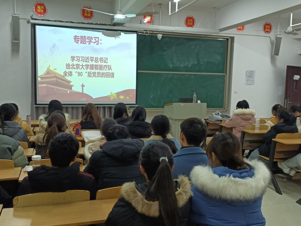 11月25日,商学院在综合楼305教室“学习习近平总书记给北京大学援鄂医疗队全体‘90后’党员回信”的主题团课。