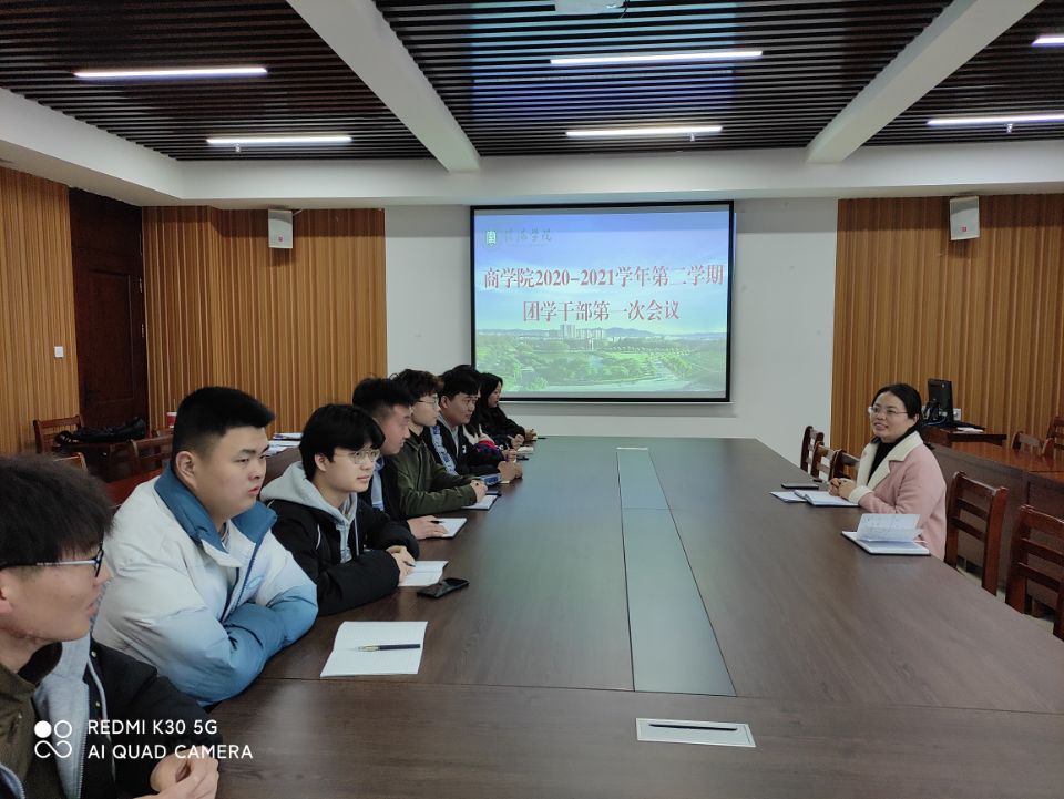 3月5日,商学院在综合楼715召开了2020-2021学年第二学期团学干部第一次会议。商学院党总支书记胡秀云、团总支书记盛士蔚出席会议,商学院团学学生组织主席团成员等参加了会议。会议由盛士蔚主持。