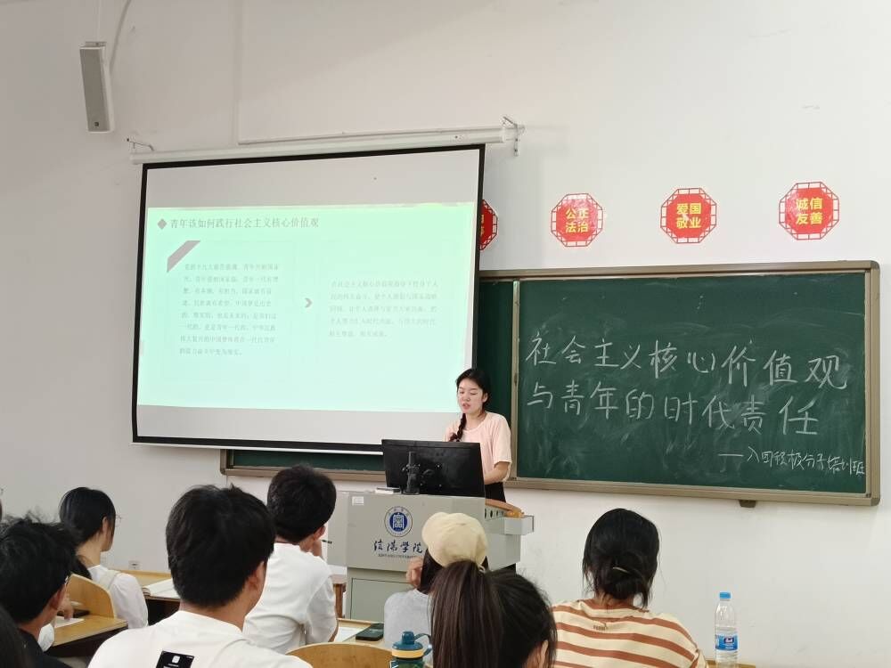 为引导青年培育和践行社会主义核心价值观,将社会主义核心价值观与青年的时代责任紧密结合起来,商学院于5月28日下午在综合楼205开展“社会主义核心价值观与青年的时代责任”为主题的团课培训,本次团课由商学院辅导员姚梦娜老师主讲,商学院2023-2024学年第二学期全体入团积极分子参与其中。