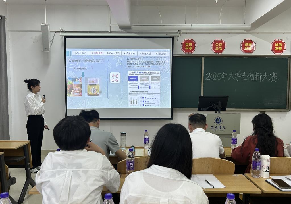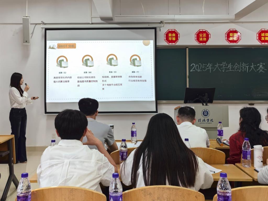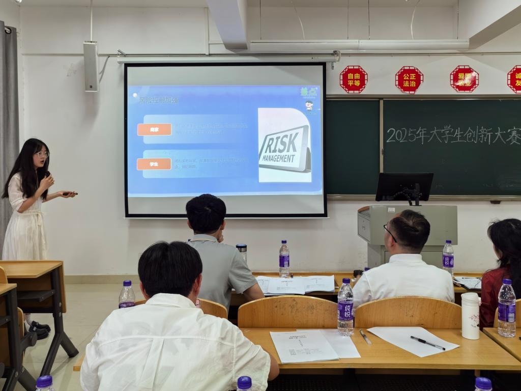 为深度挖掘商科学子创新潜能,锤炼其实践应用能力,4月28日下午,商学院在综合楼406教室举办2025年大学生创新大赛。商学院学工干事花端阳、专业教师曾云龙及全体辅导员组成评审团出席本次活动。