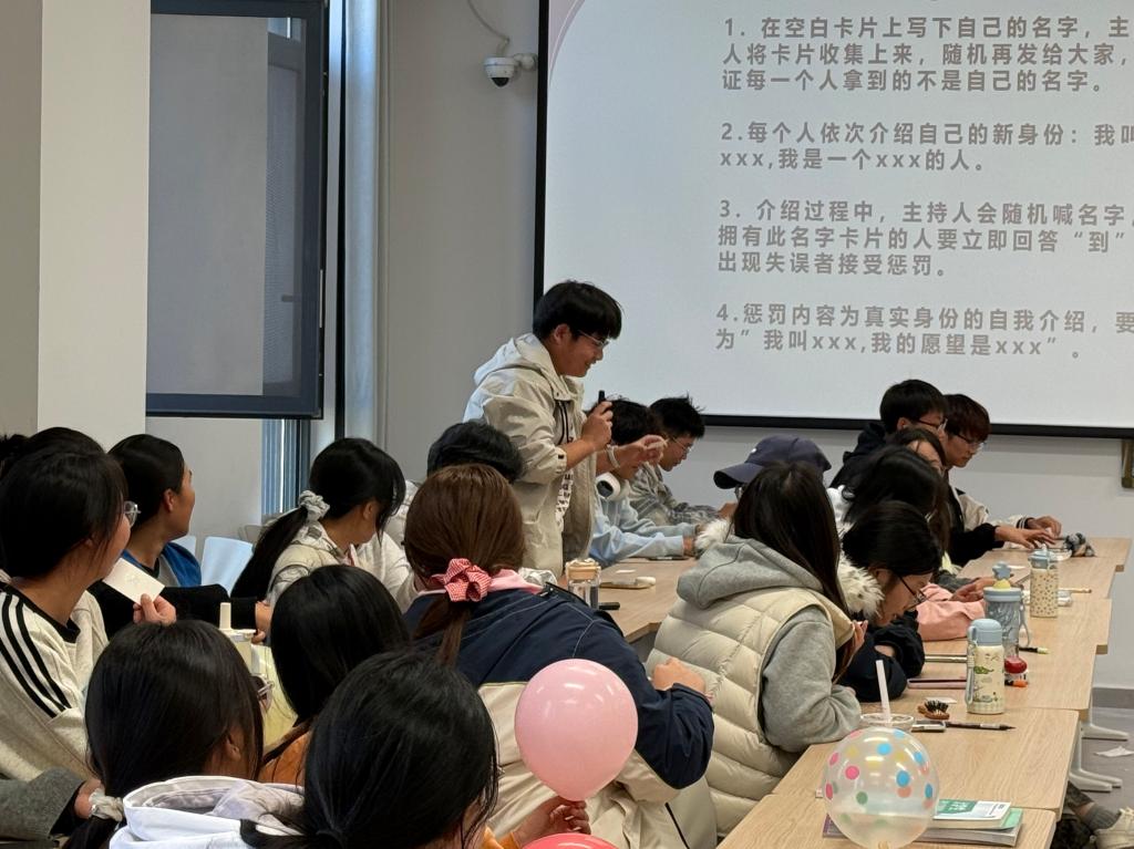 活动在趣味盎然的“交换名字”游戏中拉开帷幕。同学们通过抽签互换身份,以对方的姓名进行自我介绍。这一别出心裁的设计瞬间点燃了现场气氛,大家在新奇与欢笑中迅速打破了拘谨,不仅记住了彼此的名字,更在角色扮演中多了一份理解与亲近。