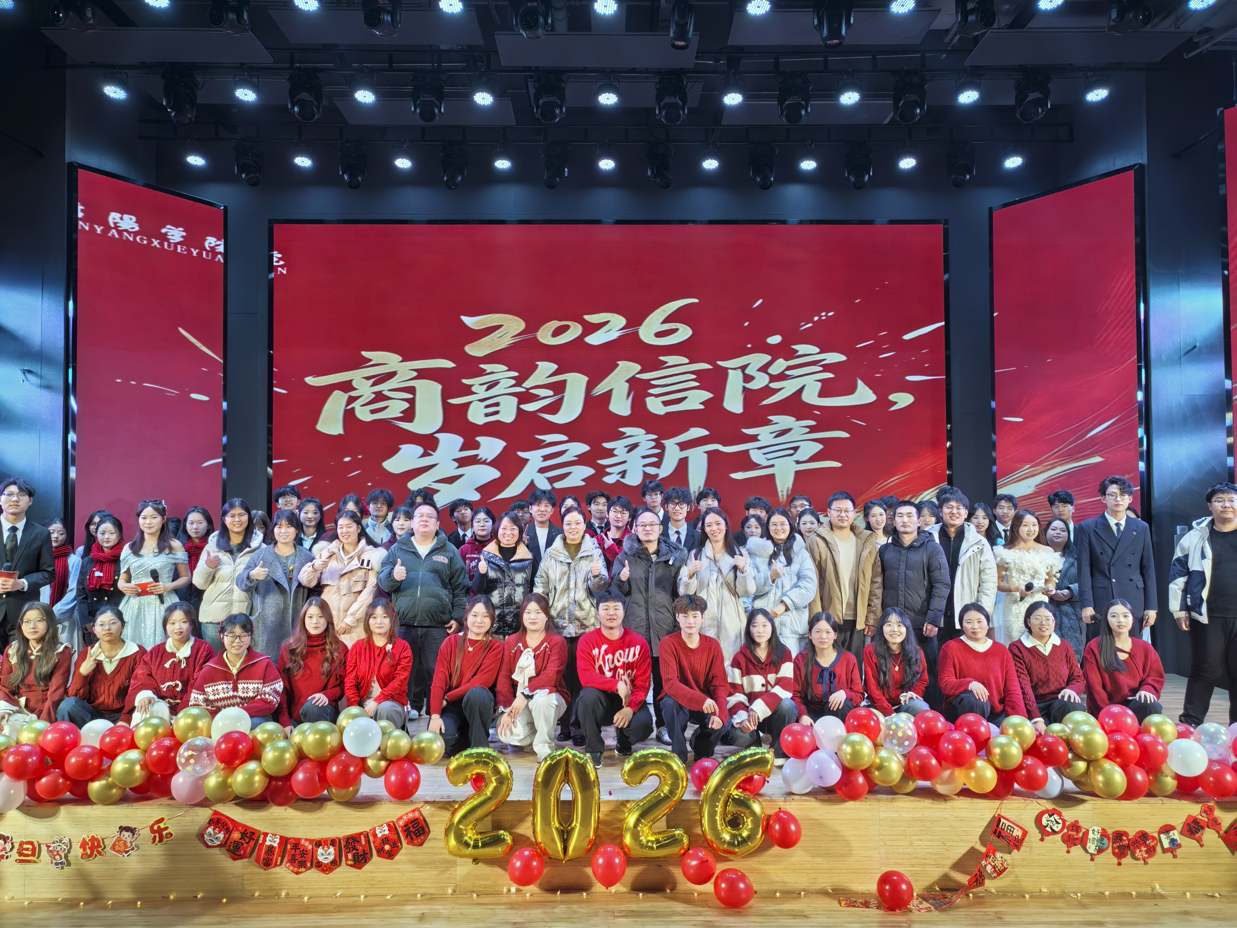为喜迎新年到来,丰富师生课余文化生活,凝聚学院发展向心力,12月22日晚,商学院在教一楼113报告厅举办2026年“商韵信院,岁启新年”元旦晚会。商学院党总支书记胡秀云、副院长吴新静、学工负责人花端阳、团总支书记乔梁、全体辅导员与师生代表欢聚一堂,共赴这场兼具青春活力与文化底蕴的视听盛宴。