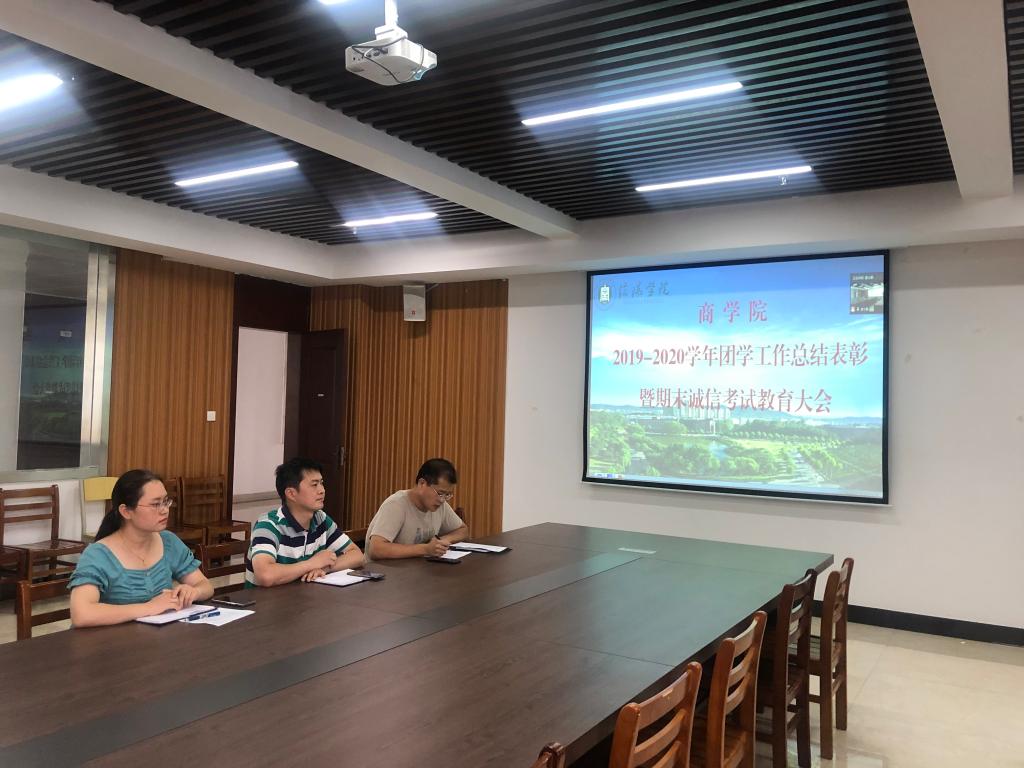 6月24日中午,商学院2019-2020学年团学工作总结表彰暨期末诚信考试教育 “云视频会议”在综合楼715召开。商学院党总支书记张富庄、学工秘书董高丽、团总支书记盛士蔚、第七届团总支学生会全体成员、各协会会长、2017级、2018级与2019级班委代表参加了本次会议,会议由第七届学生会主席杨子号主持。