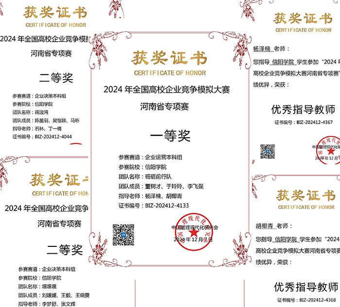 近日,全国高校企业竞争模拟大赛河南省专项赛成绩正式揭晓。商学院代表队在本次大赛中表现出色,荣获一等奖1项,二等奖2项,三等奖6项,其中董树才、于玲玲、李飞强三位同学荣获一等奖,陈星羽、吴怡颖、马昕等六位同学荣获二等奖,薛仙羽、芦明月、张梦迪等十八位同学荣获三等奖,胡椰青、杨泽楠两位教师被评为“优秀指导教师”。