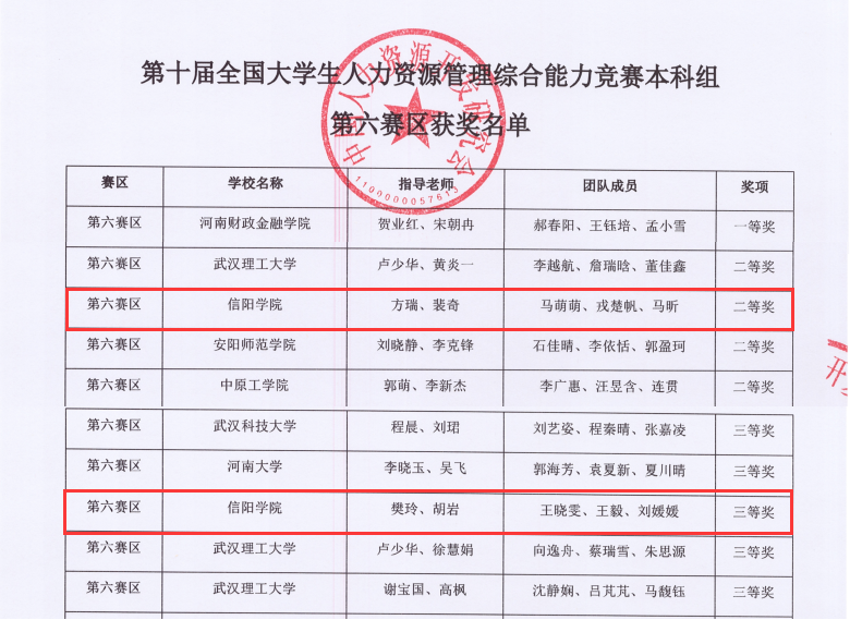 近日,第十届全国大学生人力资源管理综合能力竞赛本科组第六赛区区域赛落下帷幕。商学院两支参赛团队在裴奇、方瑞、胡岩、樊玲四位老师的悉心指导下,与来自河南、湖北、江西三大省市的河南大学、南昌大学、中南财经政法大学等高校共170支团队同场竞技,最终荣获本科组区域赛团队二等奖、三等奖,为学校赢得了荣誉。