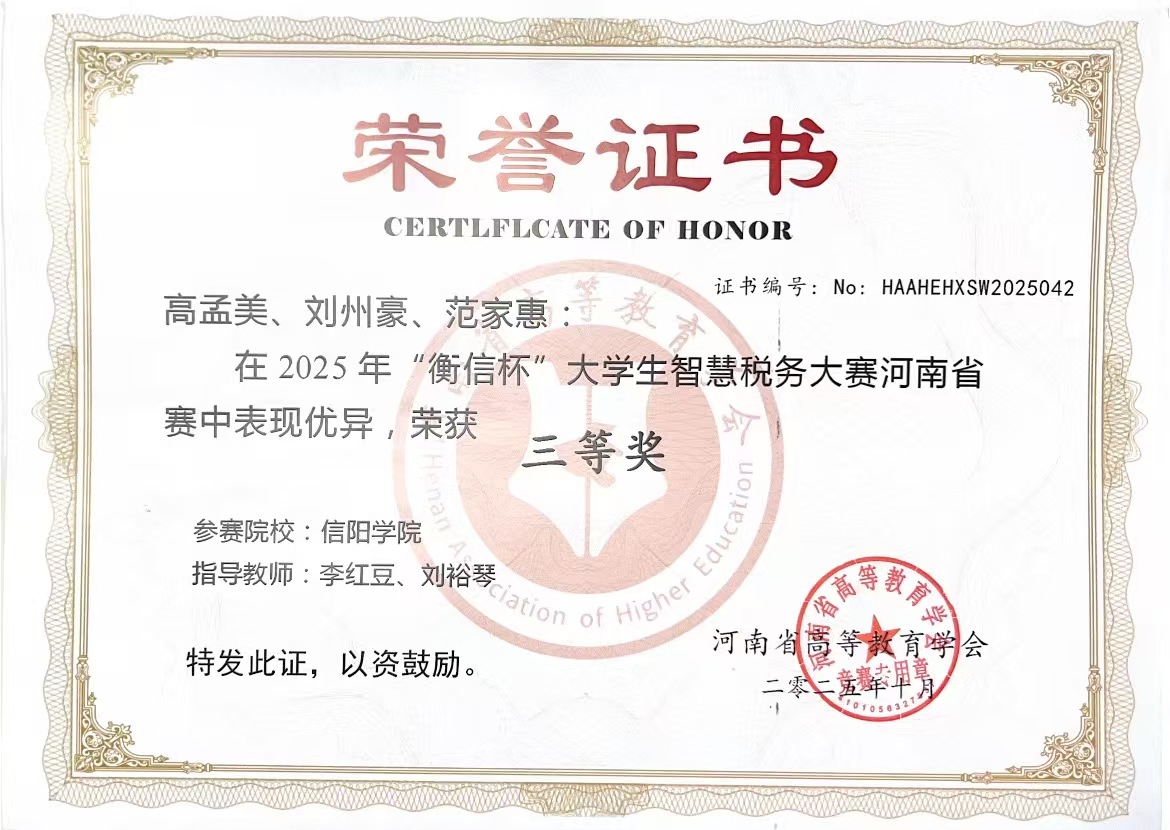 据悉,本次大赛由河南省高等教育学会主办、浙江衡信教育科技有限公司提供技术支持,以对接数字经济趋势,锤炼智慧税务技能为核心导向,共吸引全省62所高校的119支代表队同台竞技,竞争异常激烈。商学院高度重视此次赛事,精心选拔组建参赛队伍,由高孟美、刘州豪、范家惠同学组成的代表队,在指导教师李红豆、刘裕琴的悉心指导下,历经多轮备赛打磨,最终取得良好成绩。
