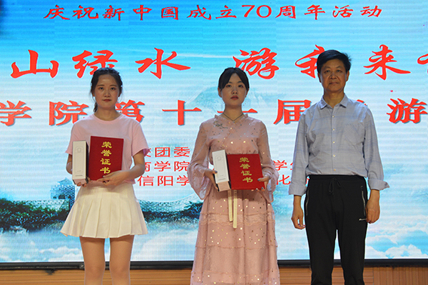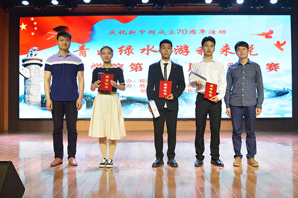 为庆祝新中国成立70周年,浓郁校园文化氛围。5月22日,“青山绿水,游我来说”信阳学院第十一届导游大赛决赛在大学生活动中心如期举行。商学院院长刘建中,教学部秘书张敬生,招生就业处干事秦金峰,心理咨询中心干事张晶晶,旅游教研室赵俊远、高翔、罗炳玲担任了大赛评委。校团委书记郑山峰,商学院党总支书记张富庄和有关学院辅导员、学生代表500余人观看了大赛。