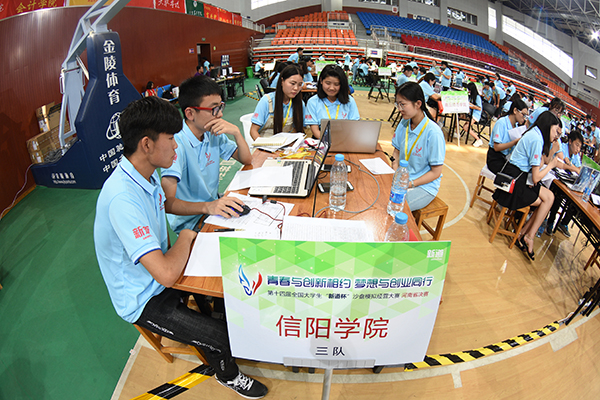 6月4日-6日,第十四届全国大学生“新道杯”沙盘模拟经营大赛河南赛区总决赛在南阳理工学院举行。河南省教育厅高等教育教学评估办公室主任曹克舜、新道科技股份有限公司副总裁刘全宝、南阳市委市政府和南阳理工学院主要领导出席开幕式并观摩大赛。来自郑州大学、河南师范大学等省内58所高校、118支代表队、近700名师生参加本次赛事。我校选派了由商学院王喜凤、王亚丹、吴新静、刘丽洁为指导老师,带领的杨欣睿、韩明明、靳汉铮等15名同学组成3支参赛队,获得2个特等奖和1个一等奖的佳绩。