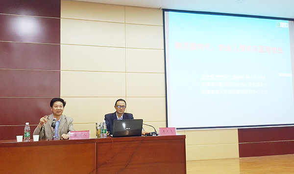 5月9日下午,河南省高校创新创业协会常务副会长、河南农业大学创新管理研究中心主任、博士生导师王文亮教授应邀在图书馆102学术报告厅作了题为《跨界新时代:创业人情商与蓝海创业》的学术报告。商学院院长刘建中教授主持报告会。商学院党总支书记张富庄和200余名师生聆听了报告。