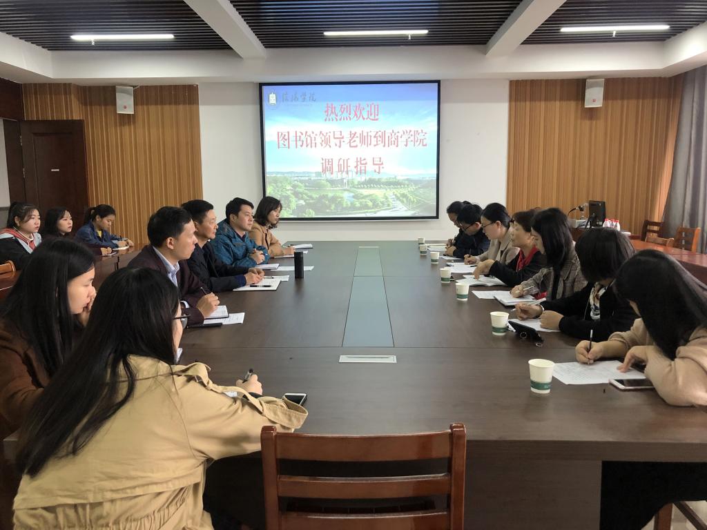 10月16日上午,图书馆馆长方瑛带领图书馆各书库有关负责人到商学院调研图书资料建设工作。商学院院长刘建中、党总支书记张富庄、教学秘书盛大俊、行政秘书高昌慧、专业教师代表和学生代表参加了调研座谈。