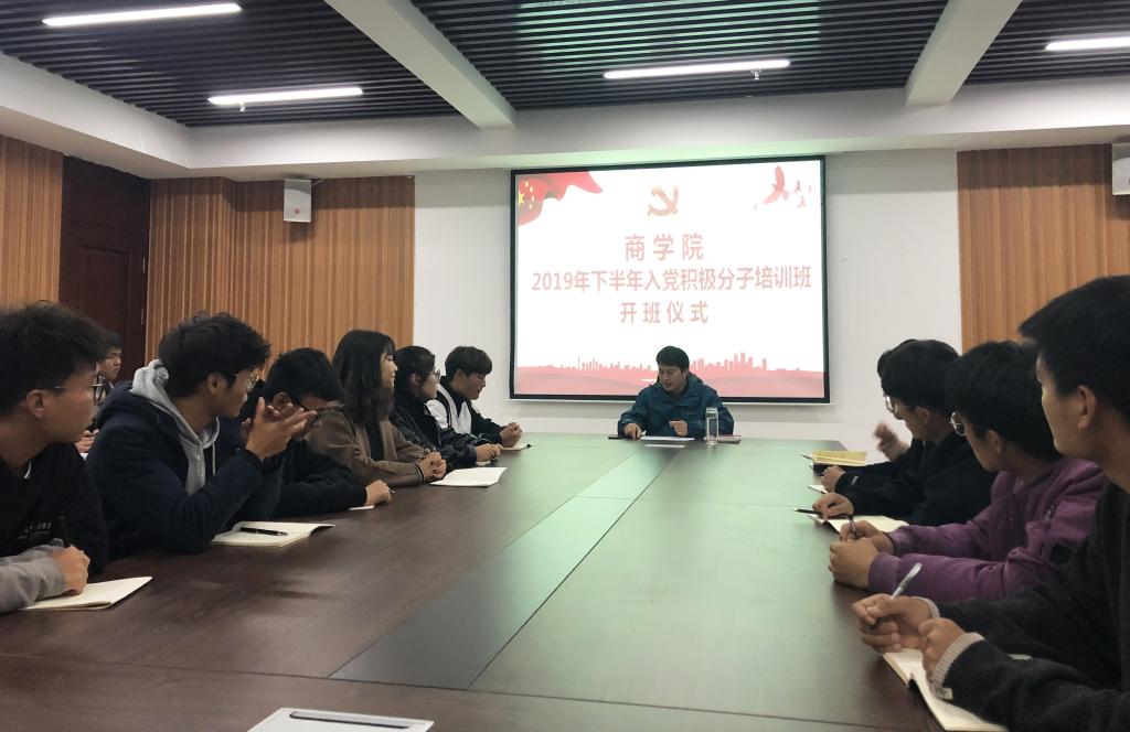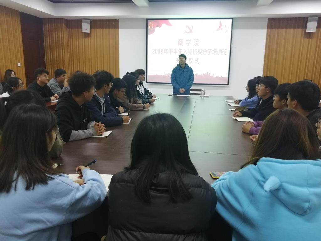 11月18日晚,商学院2019年下半年入党积极分子培训班在综合楼715会议室开班。党总支书记张富庄作了首场辅导报告,本期64名入党积极分子聆听了报告。