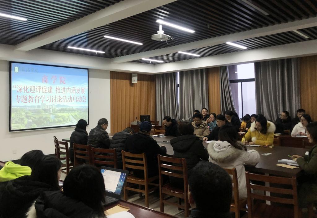 1月8日下午,商学院“深化迎评促建,推进内涵发展”专题教育学习讨论活动启动会在综合楼715会议室召开。院长刘建中、党总支书记张富庄、教学秘书盛大俊、行政秘书高昌慧和全体教师参加了会议。会议由张富庄主持。