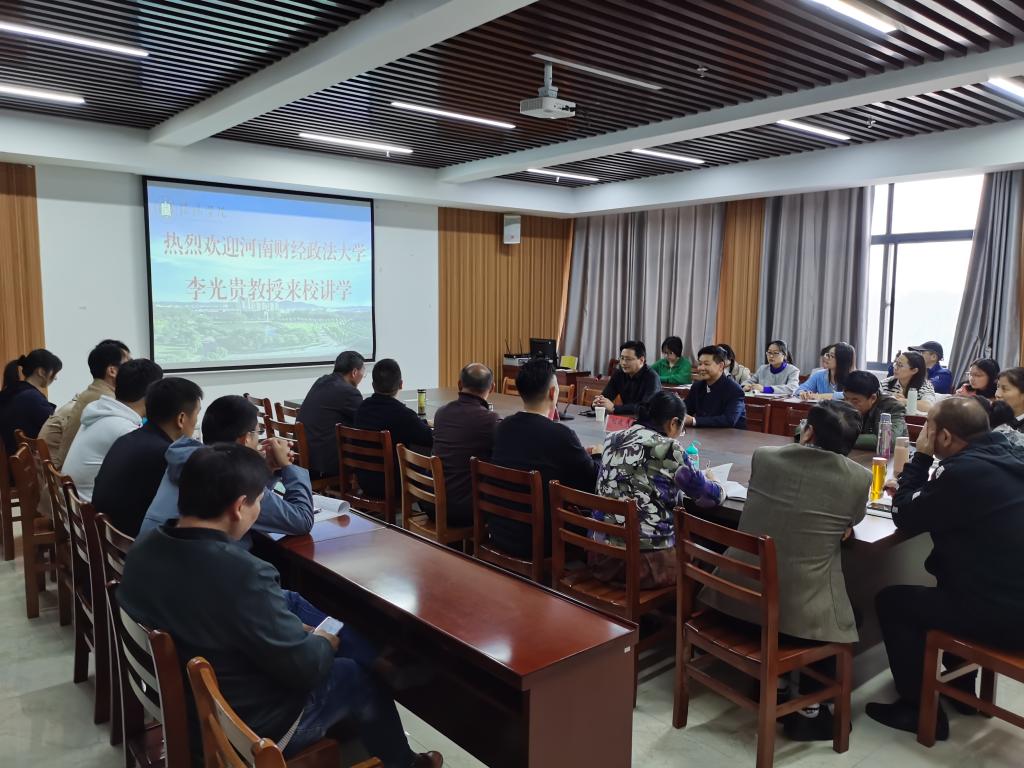 10月17日,应商学院邀请,河南财经政法大学李光贵教授在综合楼715会议室作了题为《国家社科基金项目申报体会与交流》的学术报告,商学院全体教师共同聆听了报告。报告由商学院院长刘建中主持。