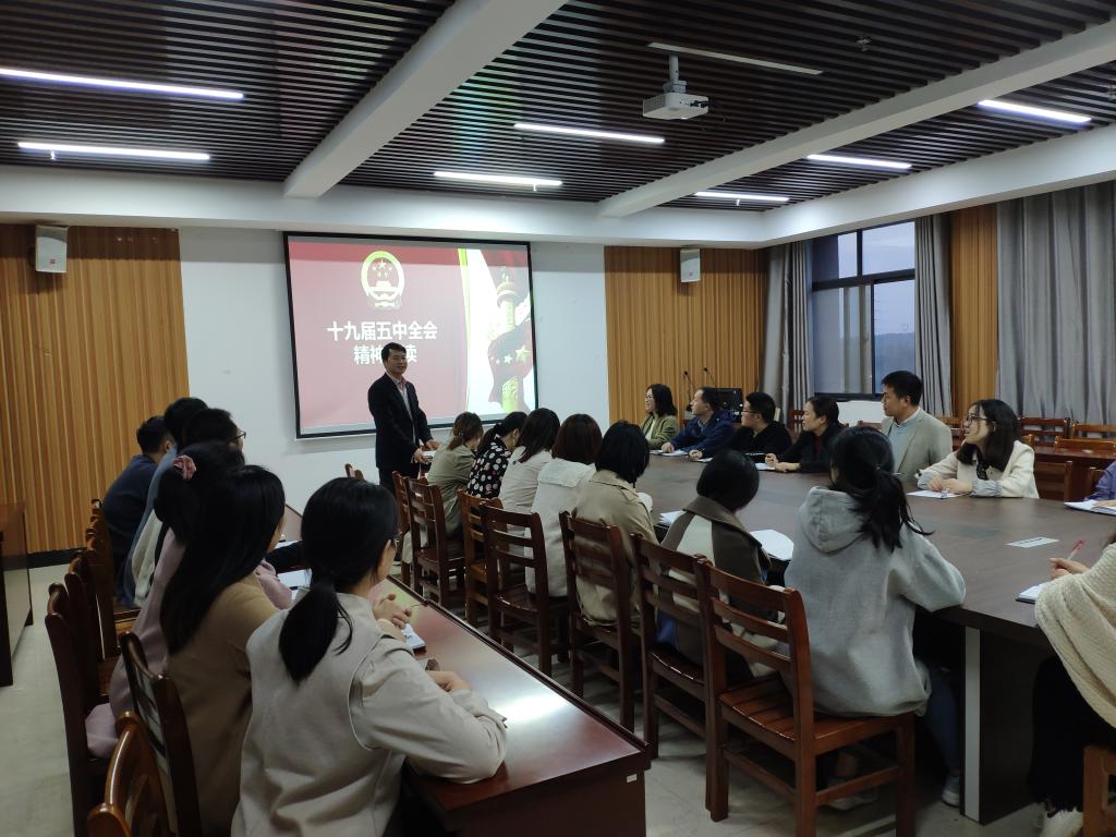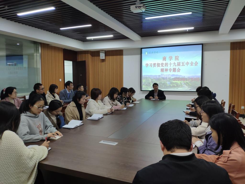为深入学习贯彻党的十九届五中全会精神,推动五中全会精神入脑入心。11月6日下午,商学院组织全体教师在综合楼715会议室开展了贯彻党的十九届五中全会精神集体学习暨课程思政建设推进会,党总支书记张富庄和全体教师党员参加了会议。