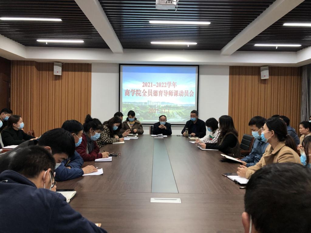 11月1日下午,商学院在综合楼715会议室召开了2021-2022学年全员德育导师课动员大会。院长于世良、党总支书记胡秀云、教学副院长李毓、学工干事黄伟及全体德育导师参加会议。