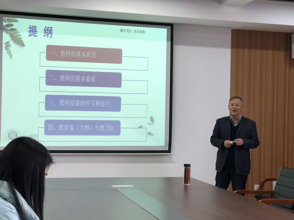 王强首先祝贺在座的新进青年教师成为一名光荣的高校教师,对大家选择信阳学院大家庭表示欢迎。他指出“师者所以传道授业解惑也”,在传递知识的过程中起着乔梁作用。教师是一份伟大的职业,燃烧自己,点亮他人。接着,他从四个方面展开培训:一是教师的基本职责,熟悉职责,才能做好本职工作;二是教师的基本素养,高尚的素质,才能为他人树立好榜样;三是教师授课的环节和技巧,把握好课程程序与规则,才能保证课堂质量;四是教育家与教书匠的区别,努力提升自己,才能促进教学质量的提高。