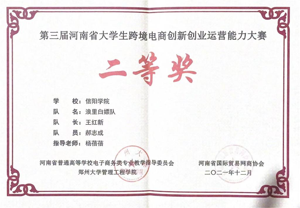 近日,由中国国际贸易学会、全国外经贸职业教育教学指导委员会主办的第三届河南省大学生跨境电商创新创业运营能力大赛圆满落幕。信阳学院两支代表队在丁一楠、杨蓓蓓老师的带领下经过三天辛苦的努力比拼,在河南省本科高校79支队伍中脱颖而出,荣获2个团体二等奖。