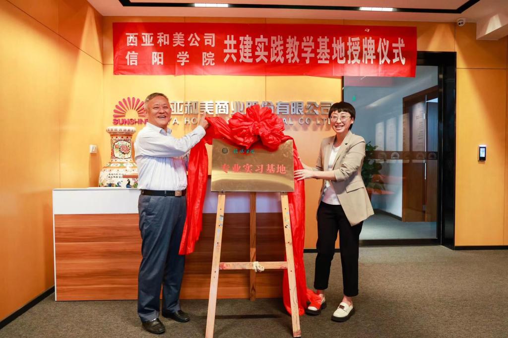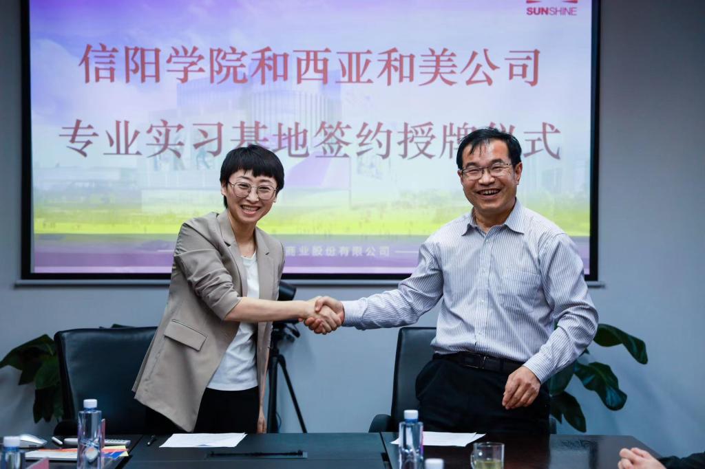信阳学院商学院院长刘玉来与西亚和美股份有限公司行政部经理花桂签署实习基地协议书。