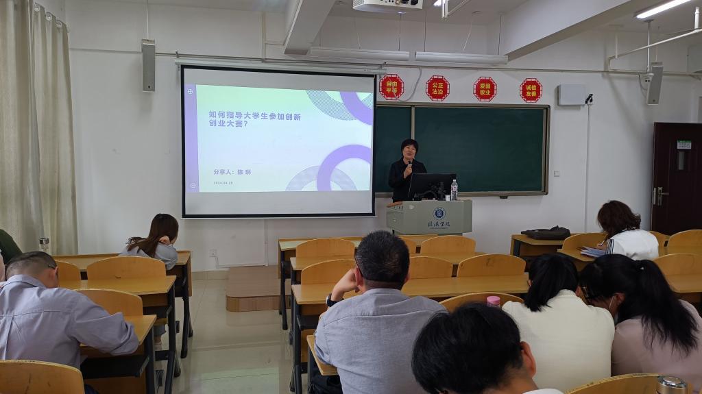 为切实推进商学院大学生创新创业大赛工作高质量开展,提升我院师生创新创业大赛参赛能力。2024年4月25日下午,我院邀请商学院特聘教授陈琳为我院青年教师举办了关于如何指导学生参加创新创业大赛的专题讲座,本次讲座在综合楼608举行。商学院副院长吴新静参加了讲座,商学院全体青年教师到场聆听。本次讲座由党总支书记胡秀云主持。