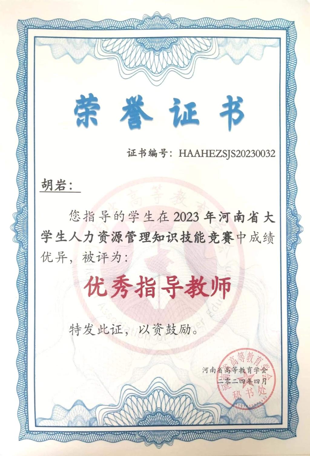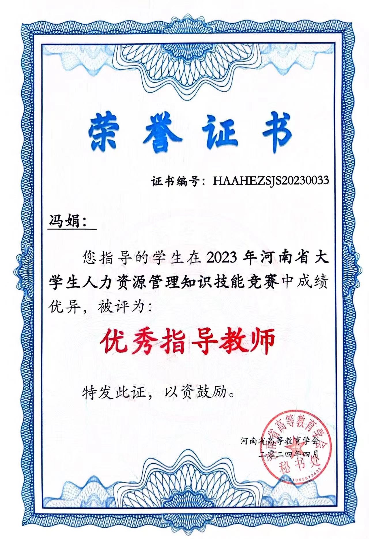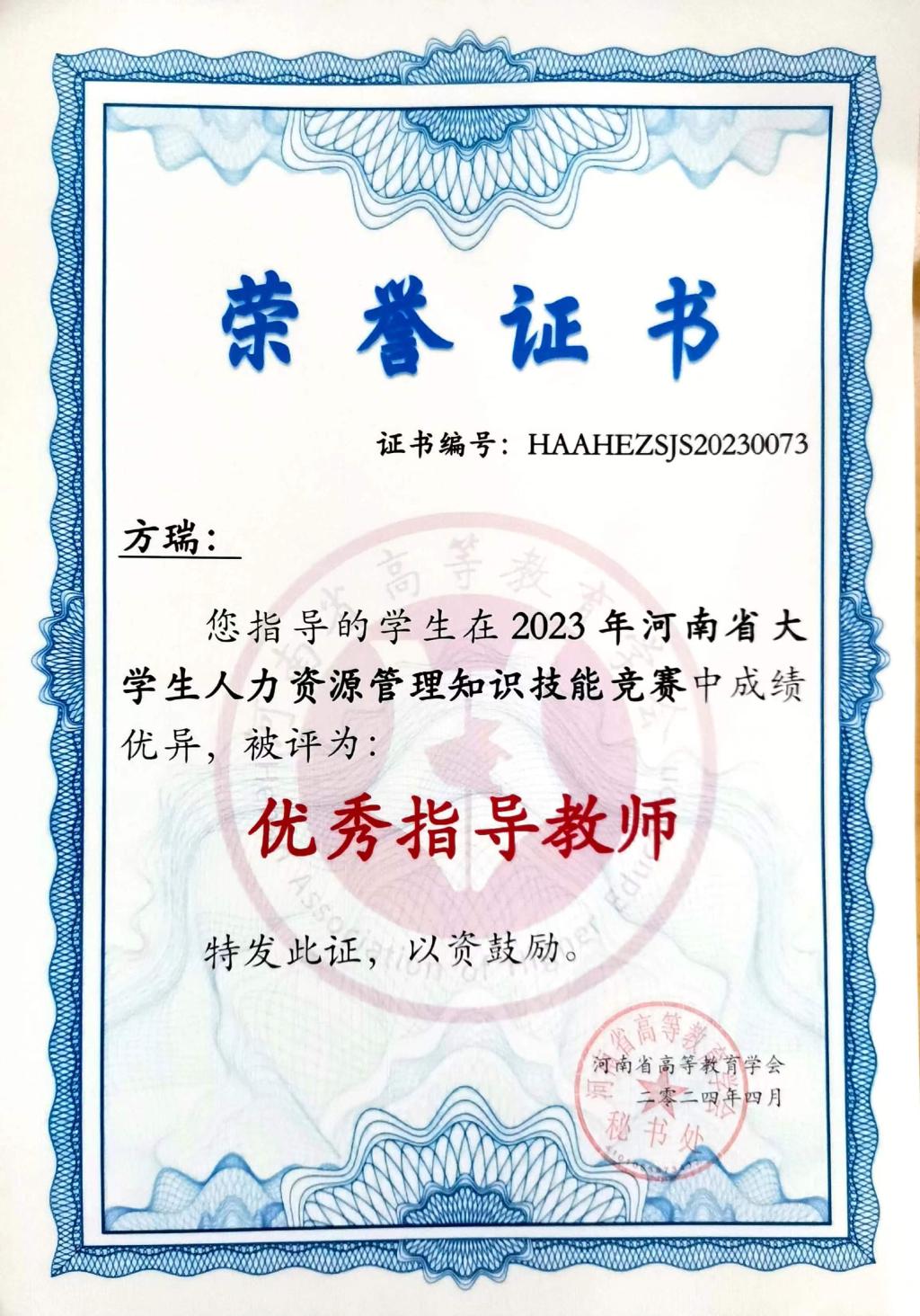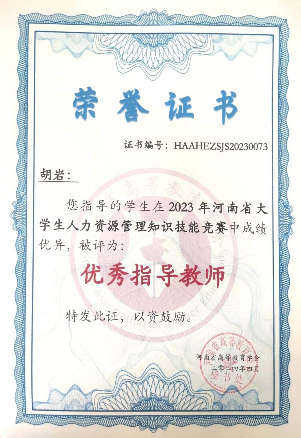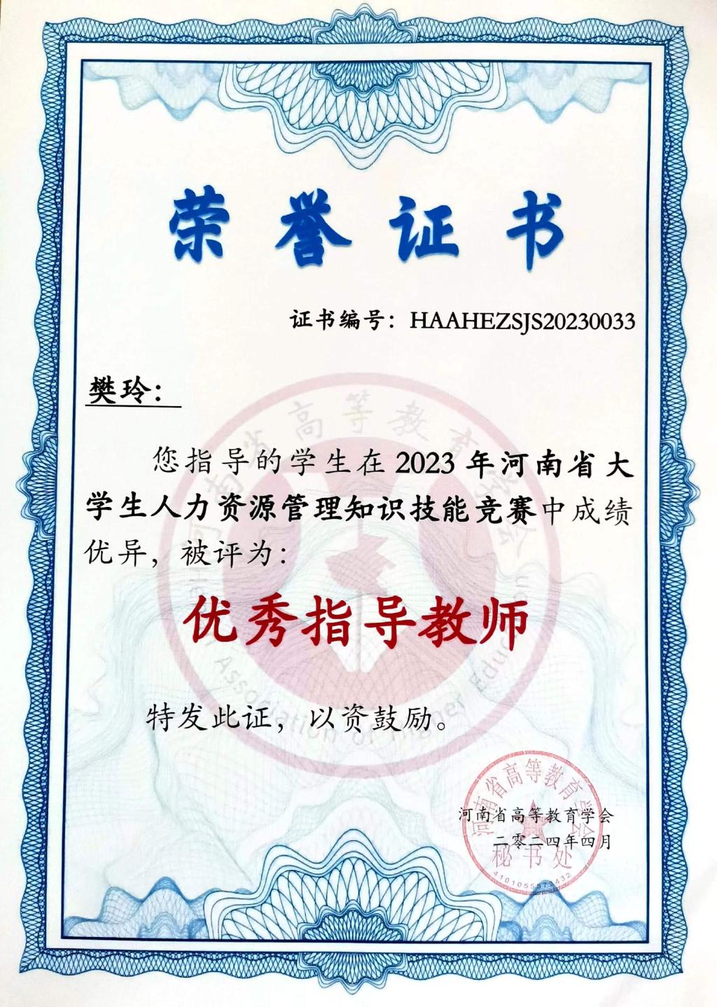 日前,由“河南省高等教育学会”主办的“2023年河南省大学生人力资源管理知识技能竞赛”落下帷幕,由胡岩、樊玲、冯娟、方瑞老师指导的三组团队,其中两组荣获全省团队二等奖,一组荣获全省团队三等奖,胡岩、樊玲、冯娟、方瑞老师被评为优秀指导教师。