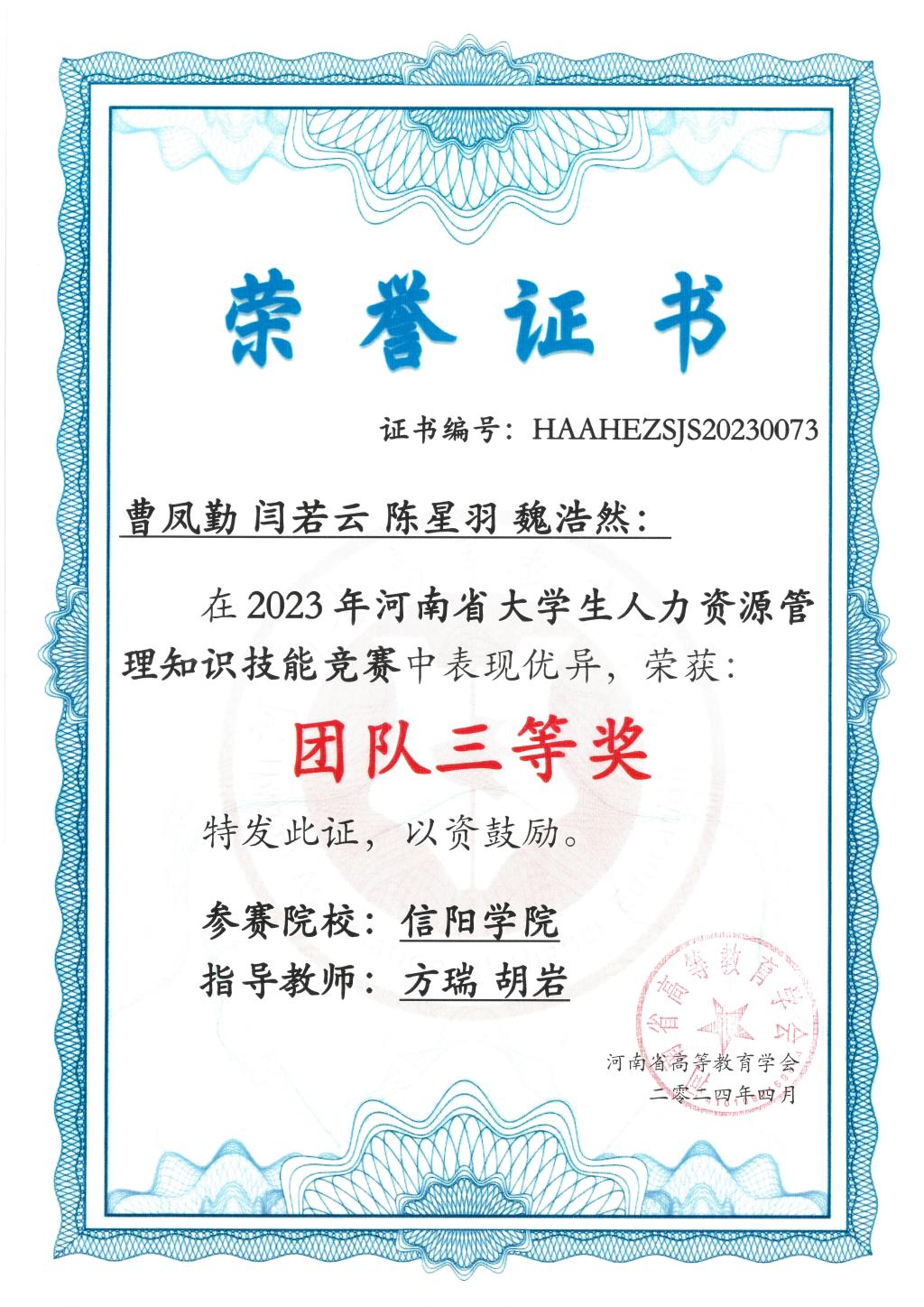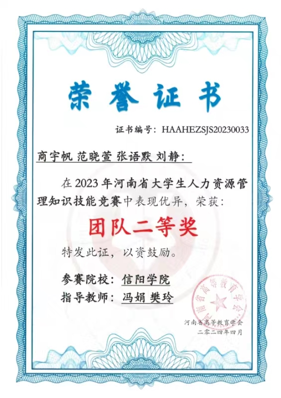 为贯彻落实党和国家关于加快推进高等教育高质量发展相关文件精神,提升高等院校大学生人力资源管理技能及人力资源管理技能教学水平,加快人力资源管理工作数字化转型步伐,满足社会对数字化复合型人力资源管理人才需求,为人力资源管理事业的发展提供新引擎、构筑新优势,河南省高等教育学会主办了河南省大学生人力资源管理知识技能竞赛。商学院学生积极报名,共确定了10组学生参加院级选拔赛,通过激烈的院级选拔赛,共有4组学生团队脱颖而出,作为代表团队参与省级比赛,同河南大学、河南财经政法大学、郑州大学、信阳师范大学等106组团队共同参与比赛,其中商宇帆、范晓萱、张语默等共3组团队都获得了不错的名次。