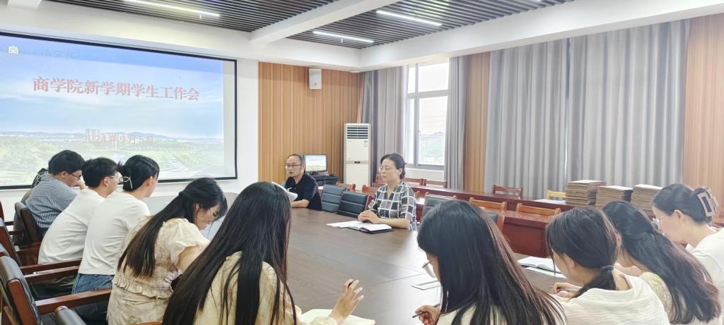 2024年9月5日下午,我院召开新学期学生工作会议,部署落实新生入学各项工作。商学院书记胡秀云、学工干事花端阳、行政干事王爱霞以及全体辅导员参加了此次会议。会议由花端阳主持。
