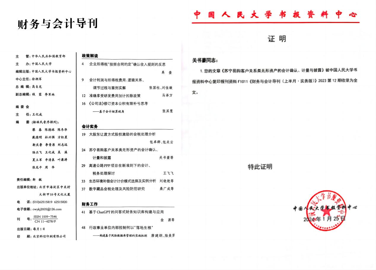 商学院青年教师关书豪的学术论文《苏宁易购客户关系类无形资产的会计确认、计量与披露》被中国人民大学复印报刊资料《财务与会计导刊》全文转载,原论文发表于核心期刊《中国注册会计师》杂志。