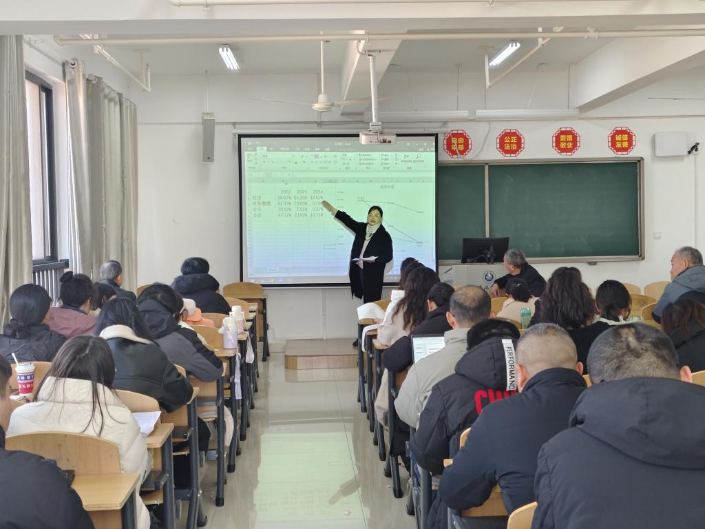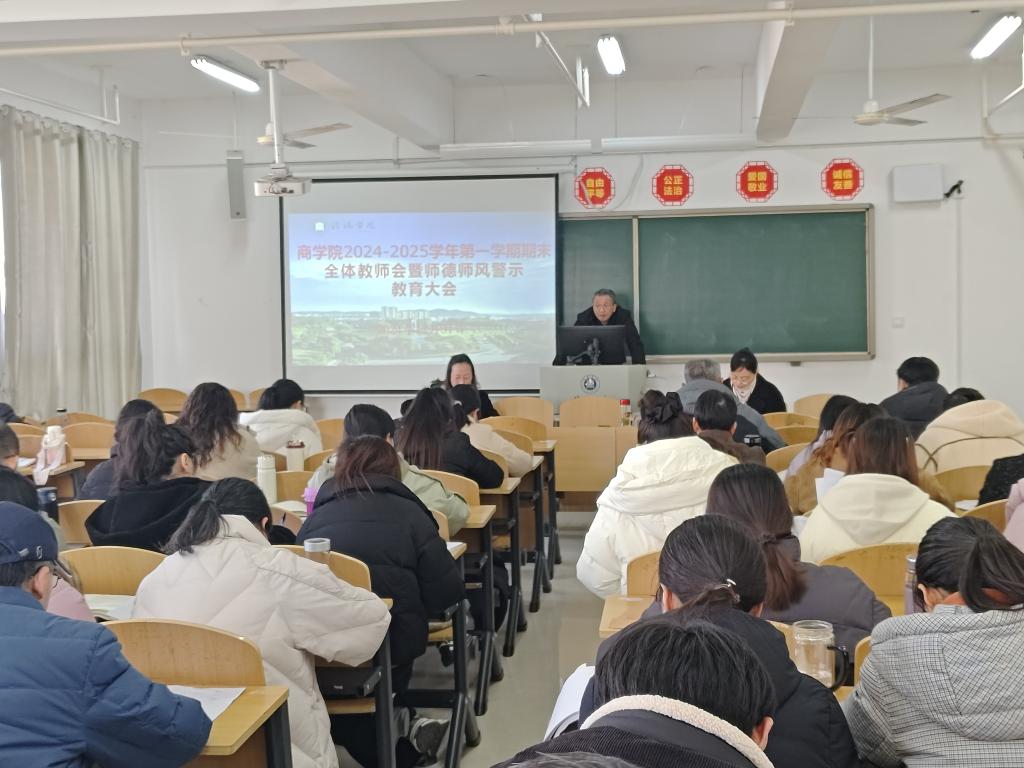 12月31日,商学院在综合楼608教室召开2024-2025学年第一学期期末全体教师会暨师德师风警示教育大会。商学院党总支书记胡秀云、副院长李毓、吴新静及全体教师参加了会议。会议由胡秀云主持。