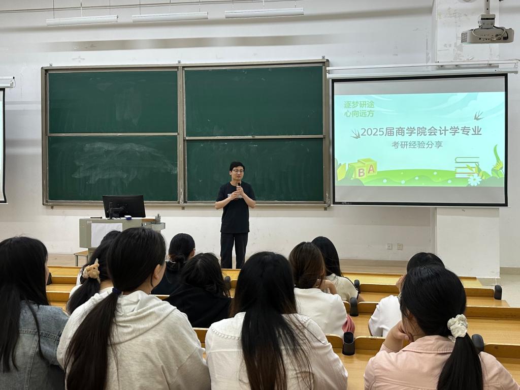 为助力会计学专业学生明晰考研方向、掌握高效备考策略,充分发挥榜样引领作用,4月25日下午,商学院在综合楼203举办会计学专业考研经验分享会。本次活动由管理会计教研室主任黄振兴主持,特邀2025届部分考研上岸学子进行经验分享,吸引了2022级会计学专业意向考研学生踊跃参与,兼职班主任郑慧慧、张文辉、马增程和李梦舒出席了活动。