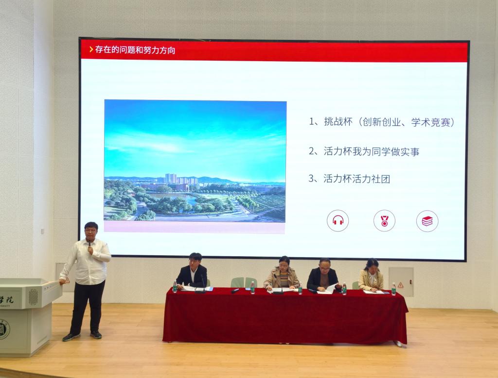 随后,乔梁老师作2024—2025学年团学工作述职报告,从思想引领、从严治团、实践育人、服务载体拓展、改革举措推进等方面,系统总结团学工作成果,同时指出工作中存在的不足和努力方向,明确新学年需重点关注“挑战杯”系列赛事、学术竞赛、活力社团建设等,要求团学组织切实为学生办实事。