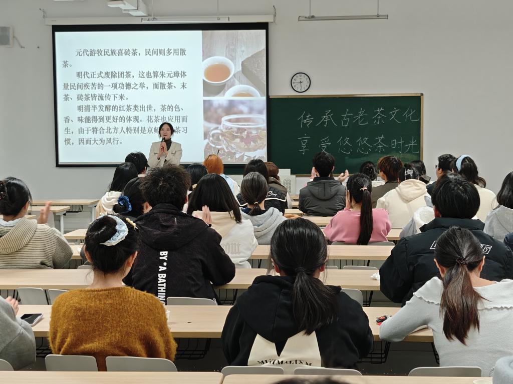 活动现场茶香氤氲,暖意融融。秦静诗老师以茶文化的历史渊源为切入点,生动梳理了其从古至今的发展脉络,带领同学们领略中华茶文化的千年底蕴,随后围绕日常品茶礼仪规范展开细致讲解,让同学们直观感受茶文化的礼仪之美。在品茶方法教学中,秦老师用通俗易懂的语言拆解茶叶冲泡、水温控制、茶汤品鉴等关键技巧,将抽象知识转化为直观可学的实操要点,助力同学们快速入门茶艺。互动交流环节,同学们踊跃分享体验心得,主动请教茶文化细节与实操疑问,秦老师耐心答疑解惑、细致点拨,现场氛围热烈而融洽,尽显茶文化交流的雅致趣味。