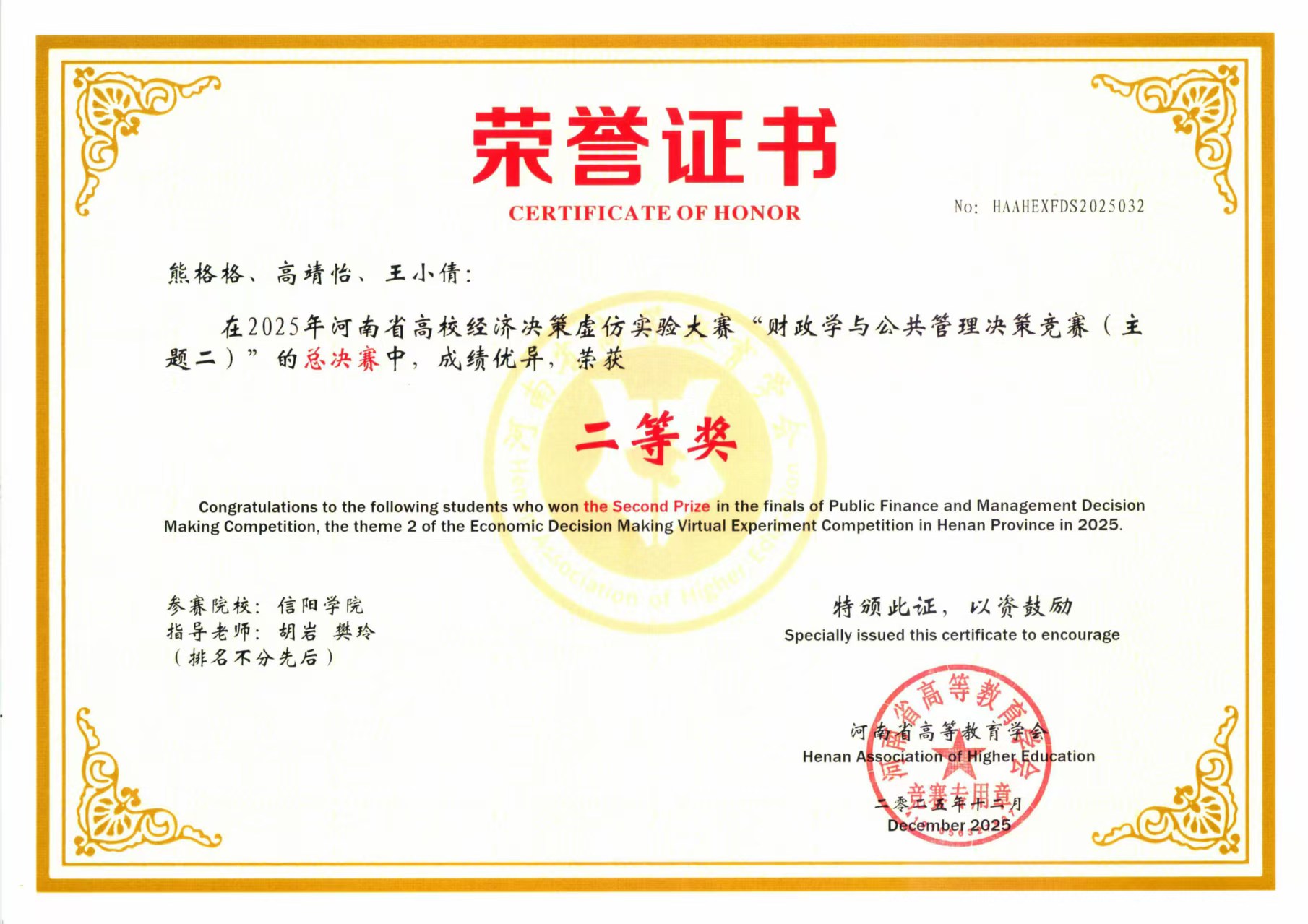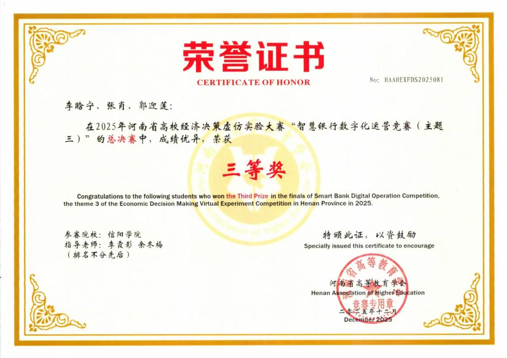 近日,2025年河南省高校经济决策虚仿实验大赛圆满落幕。商学院积极备赛、奋勇拼搏,在赛事中表现亮眼,斩获财政学与公共管理决策赛道二等奖1项、智慧银行数字化运营赛道二等奖1项、三等奖2项,用扎实的专业功底、出色的实践能力和良好的团队协作精神,充分展现了我院学子的专业素养与青春风采。