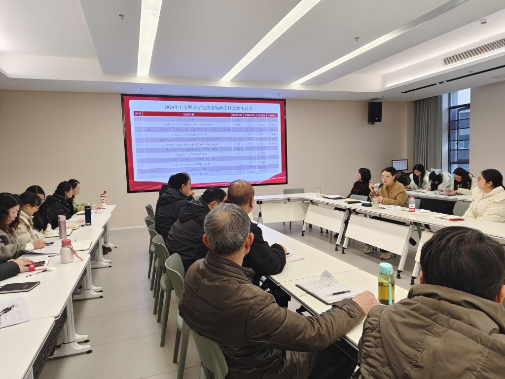 会上,党总支书记胡秀云首先通报了2025年学院在各类学科竞赛中取得的优异成绩,充分肯定了全院师生在赛事备赛、参赛过程中的努力与付出。随后,她对2026年上半年计划参与的12项重点赛事进行详细解读,明确全国企业竞争模拟大赛等重要赛事的报名时间节点与备赛具体要求,要求各专业围绕重点赛事组建专项指导团队,提前谋划选手选拔与系统培训工作,夯实备赛基础。