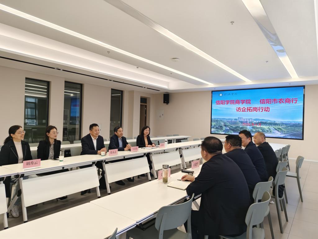 为深化访企拓岗专项行动,加强产教融合、校企合作,精准对接企业用人需求,拓宽我院毕业生就业渠道,4月16日下午,在南湖校区教三楼530会议室,商学院与河南省农商行信阳市中心支行开展访企拓岗交流座谈,学校校长助理张永志,资产处处长谭川、商学院班子成员与河南省农商行信阳市中心支行书记张晨光、副行长赵建华、公司部经理余海宇、浉河支行行长刘国强参加活动。