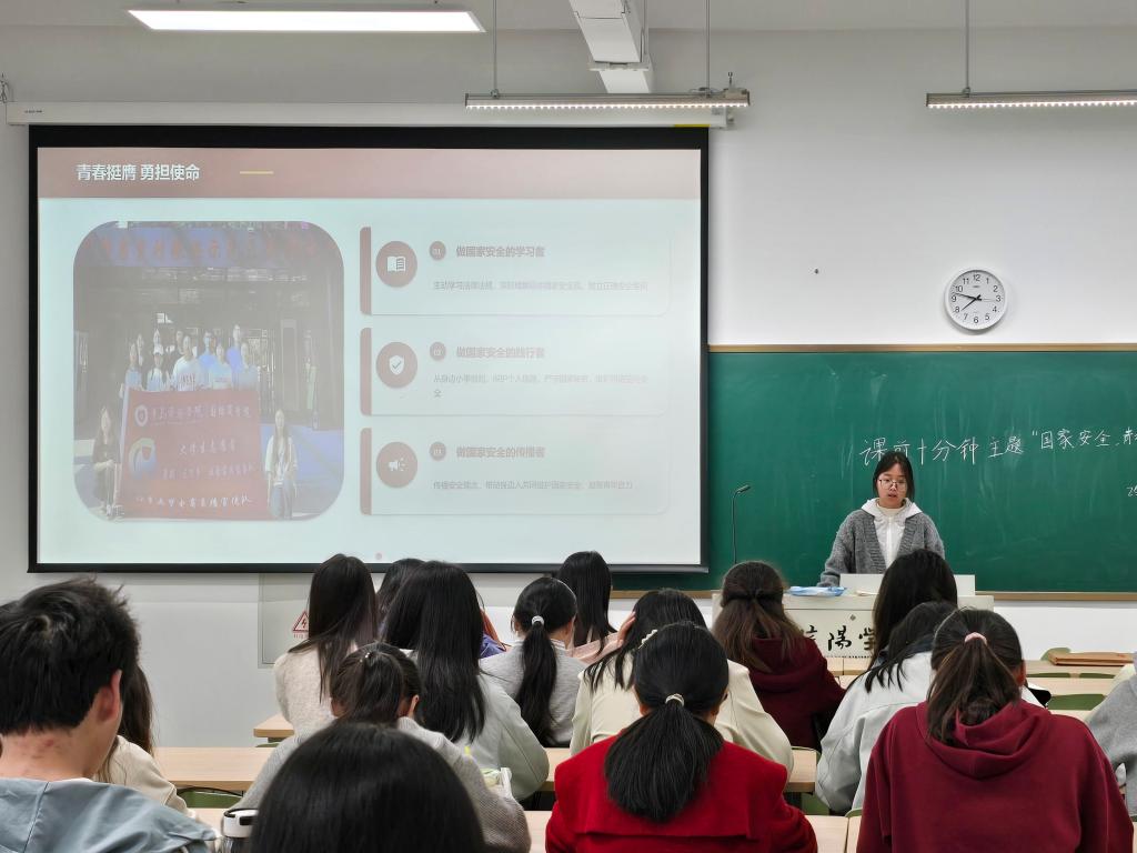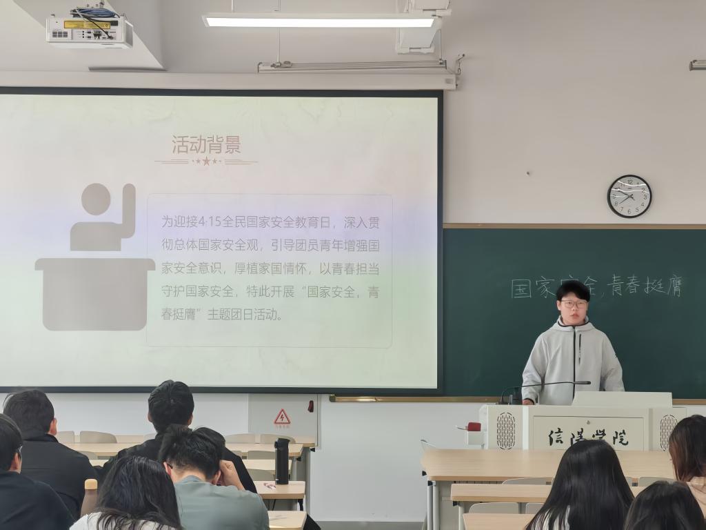 本次活动周紧扣总体国家安全观丰富内涵,聚焦政治安全、网络安全、文化安全、社会安全等重点领域,组织各团支部开展形式鲜活、内容充实的学习宣传活动。各支部以主题团日、课前十分钟主题演讲等多元形式,推动国家安全教育入脑入心。在“课前十分钟”宣讲中,同学们化身青年宣讲员,用青春话语讲安全、谈担当,让国家安全意识融入日常、浸润校园。