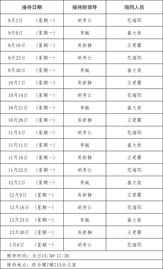 为落实《信阳学院领导接待日工作制度》(校发〔2022〕47号),现将商学院2024-2025学年第一学期院领导接待日安排公布如下:
