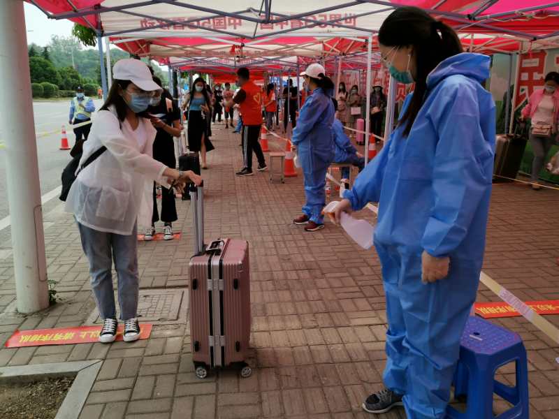 到达校门口报到点后,由辅导员和志愿者引导返校同学间隔1米有序排队,学生首先出示近14天行程卡和健康绿码,之后进行体温检测、行李消毒、手部消毒等步骤,每个环节成功完成后才能进入校园。同时,报到点还设置了观察等候区和现场咨询处,辅导员和校医院的医护人员轮流值守做好应急处置工作。