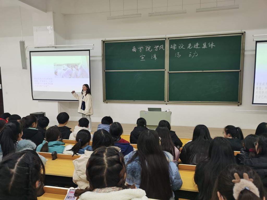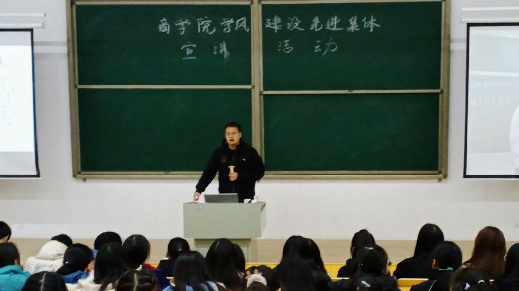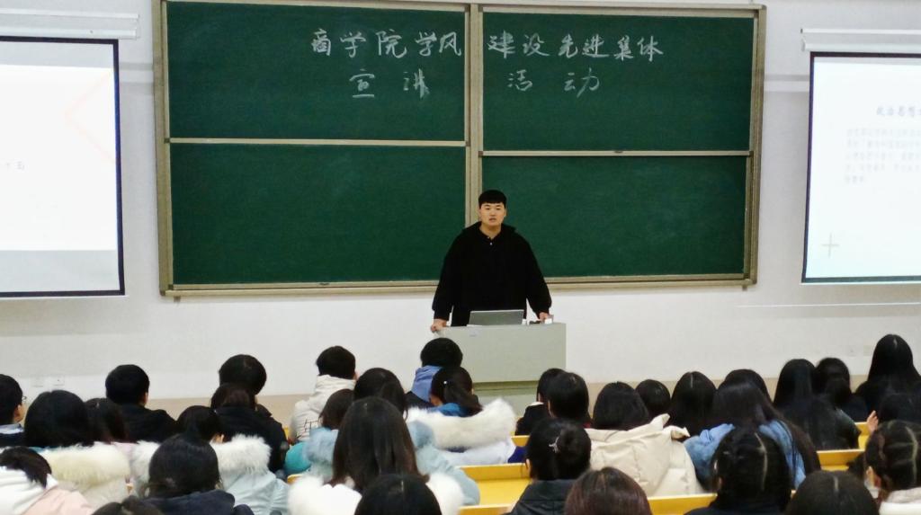 为巩固学风建设成果,努力营造比、学、赶、超的学习氛围,,12月25日晚,商学院于综合楼203教室召开了学风建设先进集体宣讲活动。团总支书记盛士蔚、各班班干部及获得20219-2020学年学风先进班集体和学风先进宿舍的宣讲人参加此次宣讲活动。