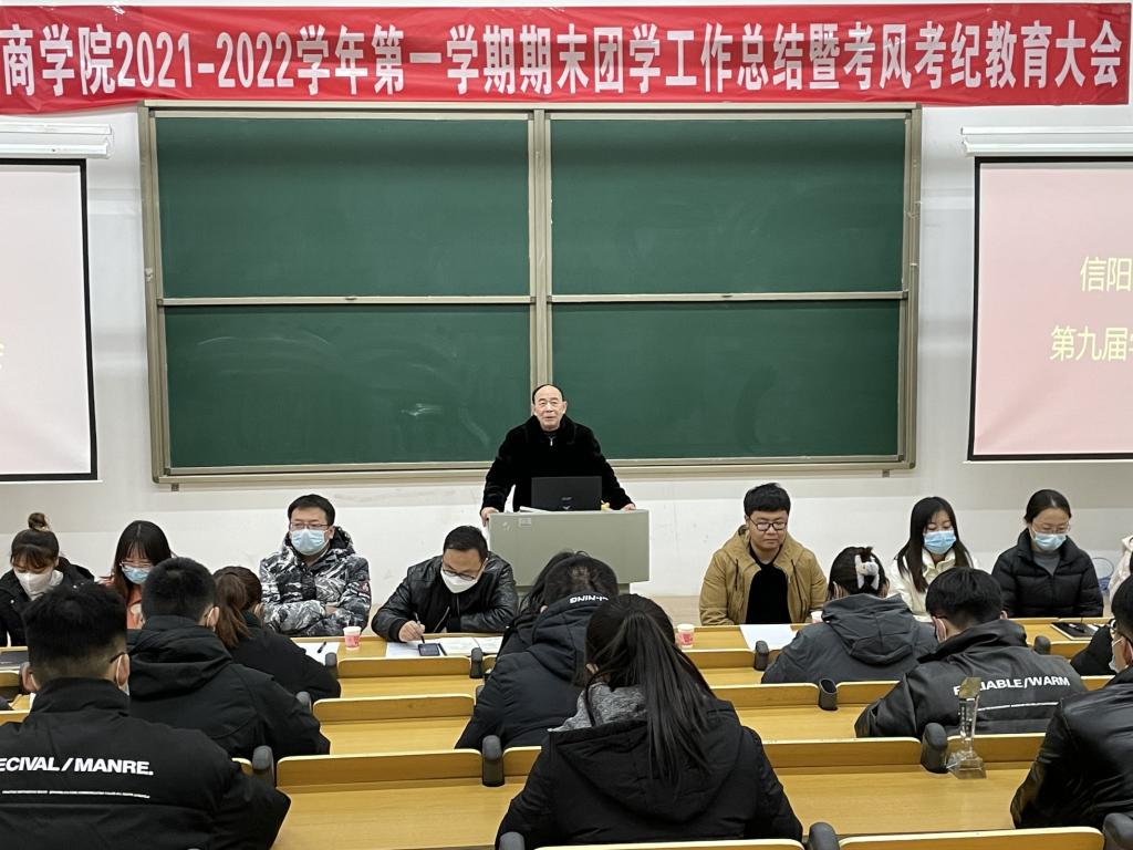 2021年12月22日,商学院在综合楼202教室成功召开了2021-2022学年第一学期期末团学工作总结暨考风考纪教育大会。院长于世良、学工负责人黄伟、团总支书记乔梁、全体辅导员及第九届团总支学生会代表和各年级班级班长团支书参加了本次会议。