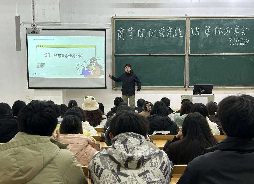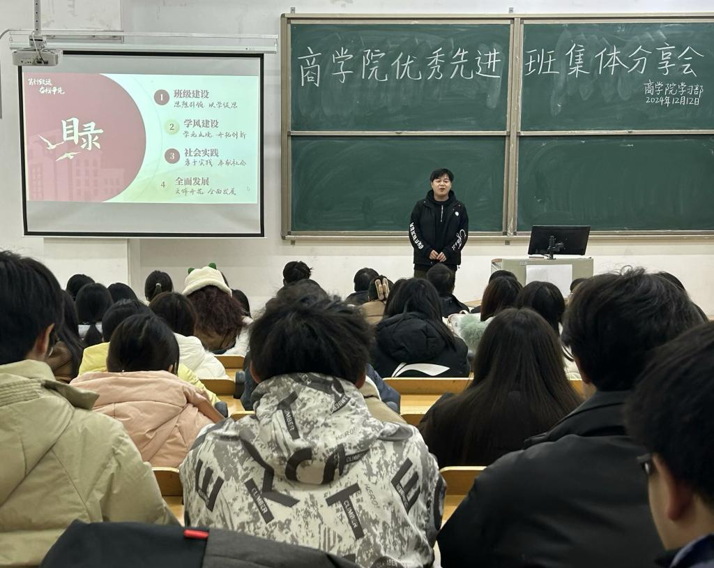 为进一步加强学风建设,巩固学风建设成果,提升班级管理水平,增强班级凝聚力,并充分发挥先进班集体的示范引领作用,商学院于12月12日晚在综合楼203教室举办先进班集体分享会,商学院全体2022级、2023级、2024级各班级代表参加了本次活动。